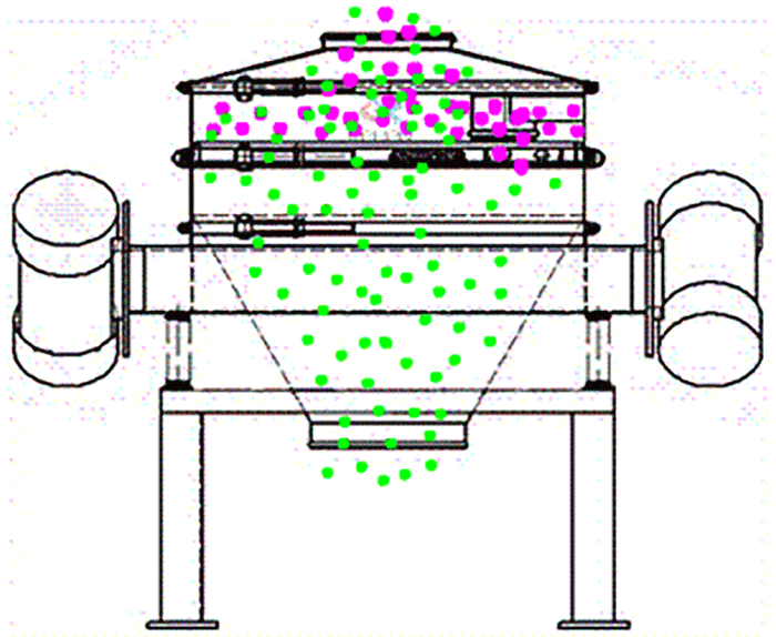 直排篩的原理是通過振動源的作用使物料在篩面做三維運動,這種運動方式可以使結塊物料散開,快速的通過篩網。精細物料直接由下部排出,雜物粗料則通過排渣出料口排出。
